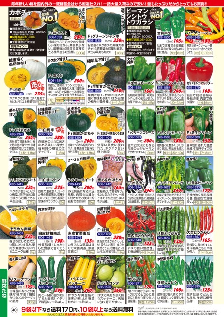毎年新しい種を国内外の一流種苗会社から厳選仕入れ!一括大量入荷なので安い!量もたっぷりだからとってもお買得!!金賞早生606-1530(3ml)145円秋まで収穫できる豊産種。果肉が厚く肉詰め料理に最高。8cm早生バナナピーマン606-1545(15粒)180円果実が緑→クリーム→黄色→オレンジ→赤へと変化します。10〜15cm中生長く収穫!カリフォルニアワンダー606-1579(1ml)148円強健で栽培容易な多収品種!肉厚で香り豊か!8cm中生甘い!F1カピアンレッド606-1564(6粒)240円完熟すると濃赤色になり甘さUP!裂果しにくく、露地栽培にも。20〜22cmザクザク収穫F1くりまさる606-1373(5粒)250円高粉質で甘味も強く、煮た時の色が鮮やか!初期の節間が短いので管理しやすい。1.5〜1.8kgF1白馬車606-1388(5ml)288円白磁器のように光沢のある美しい果皮!強粉質の極旨カボチャです。1.5kgF1栗越かぼちゃ606-1392(5ml)240円甘味たっぷり&粉質でホクホク。着果良好で日持ち性も抜群!1.6〜1.8kgF1まさかり南瓜くろまさ606-1404(5粒)200円分厚い果皮に覆われた、ホクホク甘い極上南瓜!2kgF1グリーンスターズ606-1583(8粒)200円最大200gにもなる肉厚の大型ピーマンで作りやすい。13cmF1ざくざくピーマン606-1598(0.2ml)180円樹勢強く花数多く、テリが良く美味。秀品率も高く美果!30〜40g極早生F1早生グリーン606-1600(0.2ml)150円着果性に優れた豊産品種。中獅子タイプの果形。7〜8cm早生甘味強い!長期間美味!2~3か月貯蔵高級野菜京都の伝統野菜ビタミン豊富!色鮮やか!豊産性!F1早生マロンハート606-1419(5ml)220円ホクホク旨いとんがり南瓜。開花後約35日頃から収穫できる早生品種。1.2kgF1白キントン606-1423(5ml)275円雌花の着花良く、2〜3か月の貯蔵可能。収穫後20〜50日位から粉質と甘味のバランス◎。2kgシルキースイート606-1438(5ml)200円2kg前後になる大玉品種。肉質きめ細かく甘さがあり美味!貯蔵もできお得!2kg鹿ヶ谷かぼちゃ606-1442(3ml)165円京野菜として有名なひょうたん型カボチャ。一般ではあまり出回らない希少品種。2〜4kgF1オスカー606-1614(5粒)240円ビタミンC豊富!完熟すると緑から紫黒色に。樹勢強く栽培容易。19〜21cmF1シチリアンロング606-1629(6粒)240円肉厚で果皮は光沢あるライトグリーン。耐病性あり育てやすい。21〜23cmヘルシーヌードル日本かぼちゃ貯蔵可能赤カボチャ甘い唐辛子F1豊年ピーマン606-1633(0.5ml)170円分枝力強く長期収穫可能。豊産性で食味良い。8〜9cm中生鷹の爪とうがらし606-1648(2ml)125円辛味の強い豊産性。定番品種!4cm中生伏見とうがらし606-1652(1ml)135円辛味がなく栄養価も豊富。青臭くなく優しい味。大型とうがらし606-1667(0.5ml)165円分枝多く、作りやすい。青・赤熟果ともに辛味が強い。11〜12cm激辛唐辛子中型系多収からいよ606-1671(1ml)170円青トウの時から辛く、赤トウになるとさらに激辛に!曲がり果少ない豊産種。12cm早生強健ししとう606-1686(0.5ml)140円耐病性が強く育てやすい!緑濃くよく着果し多収な品種。5〜6cmししとう606-1690(1ml)125円生育旺盛でどんどん実る、多収な優秀品種!5cm早生そうめん南瓜606-1457(8ml)220円輪切りにして茹でたり蒸したりすると、果肉が素麺状にほぐれるユニーク品種!1kg長く楽しめる白皮砂糖南瓜606-1461(10ml)198円性質強健!しっとりした食感で甘くてうまい!1kg赤皮甘栗南瓜606-1476(8ml)135円カラフルな果実は甘くて栄養満点。家庭菜園に!1.5kg色鮮やかF1紅爵606-1480(5粒)280円高粉質でホクホク・しっとり!愛らしい形で、皮ごと調理できる。収穫後2〜3か月ほど貯蔵可能。1.8kg肉詰めやオーブン焼きにF1ジオコンダ606-1526(5粒)260円球状で果形が良く揃うズッキーニ。病気に強く育てやすい。F1グリーンズッキーニ606-1507(4ml)290円肉と一緒に油炒めにすると最高!イタリア料理に。つるなし。F1イエローズッキーニ606-1511(4ml)290円鮮やかな黄金色の果実が美しい!野菜炒めに!つるなし。バターナッツ606-1495(5ml)190円甘味強くねっとり美味な極早生!繊維が少なくポタージュに最高!800g野菜たね409袋以下なら送料170円、10袋以上なら送料無料たねのご注文に代金引換はご利用いただけません。※…海外持出禁止品種(公示(農水省HP)参照)PVP播種や植え付け後の栽培条件、天候等によりその結果が異なることがありますが、弊社の責と考えられる結果不良の責めはお買い上げ代金の範囲内とさせていただきます。また、果重・糖度などはおよその数字です。※皮が切れない場合は、袋に入れて地面に叩きつけてください。栗のように甘い!甘味抜群可食部多い!黒皮系の食味自慢冬至まで貯蔵可能F1富くじ606-1354(5ml)200円粉質と甘味のバランスが良く、美味しい味自慢の大玉!開花後40〜45日で収穫できる極早生で、収穫してすぐ食べても旨い。1.6〜2kg<栽培型例>播種定植収穫貯蔵可能期間5××91011F1富くじ4678F1早生甘かぼちゃ606-1369(5ml)210円果肉が厚く、甘味が極めて強く食味も良好!味が自慢の極早生豊産種。1〜1.2kg早生埼玉ピーマン606-1550(0.5ml)160円長期間収穫可能。果実はやや大きく張りがあり、肉厚で甘い。45g早生激安ピーマン昨年人気年ピーマンシシトウトウガラシ早晩生果長(約)●標準発芽率75%●1mlあたり約80〜100粒入●発芽