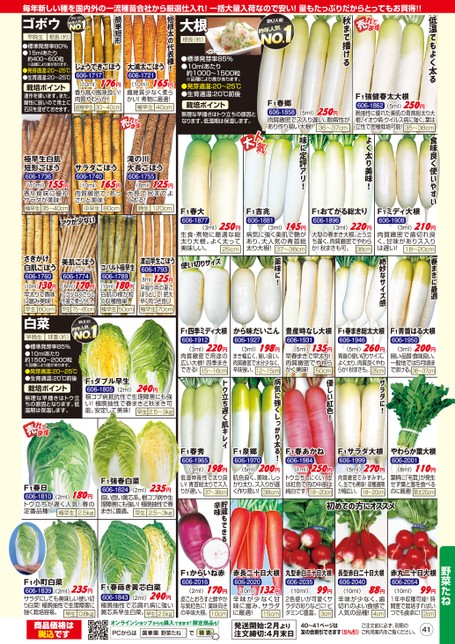 低温でもよく太る秋まで播けるF1春郷606-1858肉質緻密でス入り遅い、耐病性があり作り易い大根!36〜37cm(5ml)250円(5ml)250円F1強健春太大根606-1862晩抽性に優れた美肌の青首総太り大根。イオウ病・ウイルス病に強く、葉は立性で密植栽培可能!35〜38cmよく太り美味!味に定評アリ!大根根長(約)激安大根昨年人気昨気イメージ●標準発芽率85%●10mlあたり約1000〜1500粒※品種により差があります。●発芽適温:20〜25℃●生育適温:20℃前後栽培ポイント無理な早播きはトウ立ちの原因となります。低温期は保温します。食味良く使いやすいF1ミディ大根606-1908(3ml)210円肉質緻密で歯切れ良く、甘味がありス入りは遅い!18〜20cm春まきに最適絶妙なサイズ感F1四季ミディ大根606-1912(3ml)220円肉質緻密で用途の広い大根!四季まきできる!15〜16cmから味だいこん606-1927(3ml)198円まき幅広く、揃い良い。肉質緻密で水分少なく、辛味強い。12〜15cm豊産時なし大根606-1931(5ml)135円早春まきで早太り!肉質緻密でやわらかく美味!50cmF1春まき総太大根606-1946(5ml)260円青首の使い切りサイズ。よく太り、肉質良くやわらか!秋まきも。25cmF1青首はる大根606-1950(3ml)200円揃い・品質・食味良い。一般地では5月頃までまける。36〜37cm(3ml)198円低温伸長性で太り良い!青首総太りでス入りが遅い。37〜38cm(5ml)200円肌色良く、美味。しっかり太り、ス入りが遅く作り易い!38cm(1ml)250円トウ立ちしにくい!皮は紅色で肉の中部は純白です。18〜20cmF1春あかね606-1984F1サラダ大根606-1999(5ml)270円肉質緻密でみずみずしく、生でも美味!収穫適期が幅広い。18〜20cmやわらか葉大根606-2001(8ml)110円葉柄に「毛茸」が発生せず葉と茎を食べるのに最適!草丈20cm初めての方にオススメ貯蔵もできる辛味サラダに!優しい紅色!病気に強くしっかり太る!F1泉郷606-1970トウ立ち遅く肌キレイF1春秀606-1965F1吉兆606-1881(3ml)145円病気に強く美肌で艶があり、大人気の青首総太り大根!37〜38cmF1おてがる総太り606-1896(3ml)220円大型の春まき大根。とう立ち遅く、肉質緻密でやわらか!秋まきも可。38cm薬味に!F1春大606-1877(3ml)250円生食・煮物に最適な総太り大根。よく太って美味しい。25cm使い切りサイズ短根太の代表種!大浦太ごぼう606-1721(10ml)165円繊維質少なく柔らかい!煮物に最適!40cm極早生簡単短形ゴボウ激安ゴボウ昨年人気年気早晩生根長(約)●標準発芽率80%●15mlあたり約400〜600粒※品種により差があります。●発芽適温:20〜25℃●生育適温:20〜25℃栽培ポイント連作を嫌います。また、酸性に弱いので用土に石灰を混ぜておきます。じょうできごぼう606-1717(10ml)176円香り高く風味良い!肉質やわらか!超極早生30〜40cm極早生白肌短形ごぼう606-1736(10ml)155円香り食味に優れサラダが美味!極早生35〜40cmサラダごぼう606-1740(10ml)165円肉質緻密で、あっさりと美味!中早生80cm滝の川大長ごぼう606-1755(8ml)125円大長で尻までよく太る!晩生120cmアクが少ないさきがけ白肌ごぼう606-1760美肌ごぼう606-1774※PVP21394コバルト極早生606-1789(10ml)130円早太りで香味に富み美味!早生80cm(8ml)170円アク少なくさらし不要で柔らかい。75〜85cm早生(10ml)180円白肌の根が短く収穫簡単。極早生50cm白菜激安白菜昨年人気人渡辺早生ごぼう606-1793(8ml)125円早堀り用の夏ごぼうとして!肥大早く肉つき良し!極早生70cm早晩生球重(約)●標準発芽率85%●10mlあたり約1500〜2000粒※品種により差があります。●発芽適温:20〜25℃●生育適温:20℃前後栽培ポイント無理な早播きはトウ立ちの原因となります。低温期は保温します。(2ml)240円F1ダブル早生606-1805根コブ病抵抗性で生理障害にも強い!極晩抽性で春まきと秋まき可能。安定して美味!早生2.5〜3kgF1春日606-1810(2ml)180円トウ立ちが遅く人気!春の定番品種!極早生2.5kgF1強春白菜(2ml)235円606-1824揃い良い黄芯系。根コブ病や生理障害にも強い!極晩抽性で春まきに最適。早生2.〜3kg毎年新しい種を国内外の一流種苗会社から厳選仕入れ!一括大量入荷なので安い!量もたっぷりだからとってもお買得!!野菜たね長型赤白二十日大根606-204088円(10ml)辛味が少なく、歯切れのよい食感で人気の品種!4cm赤丸二十日大根606-205499円(10ml)1年中収穫可能!時間差で栽培すればいつでも食卓に!2cm40〜41ページは友の会割引できます(5%引)ご注文前に必ず、別冊のご利用案内をご覧ください。41F1小町白菜(2ml)235円606-1839サラダにしても美味しい使い切り白菜!極晩抽性で生理障害に強く栽培容易。早生0.8kgF1春蒔き黄芯白菜(2ml)240円606-1843極晩抽性で芯腐れ病に強い黄芯系早生白菜。早生2.5kgF1からいね赤606-2016(2ml)170円皮ごとおろすと鮮やかな紫紅色に!薬味向きの辛味大根。10cm商品価格は税込ですオンラインショップからも購入できます!限定商品も!PCからは野菜たね丸型赤白二十日大根606-2035(10ml)99円2色使いが可愛くサラダの彩りなどに!ビタミンC豊富。3cm赤長二十日大根606-2020(10ml)132円辛味が少なく甘味に富み、サラダに最適!15cm発送開始:2月より注文締切:4月末日