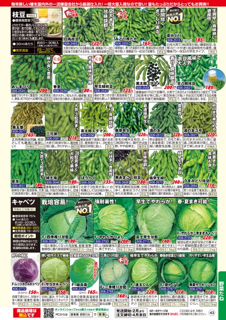 生育早く食味良い豊産性秋口まで楽しめる(50ml)夏みどり606-2510白毛大莢で3粒莢率が高い豊産枝豆。生育スピードが速く低温伸長性も優秀。播種後75〜80日の早生タイプ。早生185円茶豆風味で大人気イメージ香り・食味最高毎年新しい種を国内外の一流種苗会社から厳選仕入れ!一括大量入荷なので安い!量もたっぷりだからとってもお買得!!激安枝豆昨年人気昨年人節間短くぎっしり実る豆大きく甘味抜群!イメージ白鳥枝豆606-2493大莢が房なりになる豊産品種。播種後70〜80日前後で収穫できる早生。甘味・風味抜群!早生125円(40ml)みどりゆたか606-2505草勢強く、莢つき抜群の大莢。豊満な莢は3粒莢率が高い!播種後70〜80日で収穫可。早生165円(40ml)定番芳香・風味が自慢約60〜90粒入※品種により差があります。定番味が良く豊産●発芽適温25〜30℃※適温を保ちましょう。枝豆早晩生●標準発芽率75%とりたてが一番おいしい枝豆は鮮度が命!畑で収穫してすぐに茹でた枝豆はまさに絶品!買ってきた枝豆との違いを味わってみてください♪おつまみにも重宝します。●30mlあたりあじまつり606-2524200円強健で作りやすく豊産性!3粒莢率高く、美味。約76日から収穫可能。極早生(30ml)香里606-2539180円莢が大きく、粒も大きい豊産種!実は甘味があり香ばしく風味抜群。中晩生(40ml)早生緑枝豆606-2543極めて莢つきが良く栽培容易です。莢色も美しい!播種後約80日!125円(40ml)早生(30ml)黒太郎エダマメ606-2558200円播種後約75日で収穫可。大莢で3粒莢率が特に高い!黒豆特有の甘味・芳香で食味最高!早生(20ml)甘八郎枝豆606-2562180円茶豆のような風味をもつ緑豆で、甘味が強い!約80日で収穫できる白毛種で、3粒莢の割合高く、多収。中早生豊産性!最速極早生!香り・食味抜群大莢・3粒莢多い黒五葉606-2577(30ml)165円正月用煮豆は勿論、枝豆としても最高に美味しい!7cm中晩生三兄弟210円606-2581大莢で3粒莢が多い。露地栽培に適し、作りやすい。極早生(30ml)茶太郎エダマメ606-2596(30ml)200円風味抜群で食味に優れる茶豆。着莢数が多く、3粒莢の割合が非常に高い。早生(30ml)奥原早生606-2665220円茶毛の極早生枝豆。2〜3粒莢が多く、鞘付きは抜群。やや低草丈。極早生(30ml)酒の友606-2612220円莢は濃緑色で、白毛で美しく食味最高!3粒莢率が高い豊産性品種。中早生(30ml)酒の友3号606-2627220円6月まき9月どり用に最適。3粒莢率が高く、秋口まで楽しめます。中晩生莢着きも食味も良し極早生で多収甘味抜群!黒あまこく枝豆606-2608(30ml)180円早生系黒枝豆品種。分枝多く、食味はコクと甘味あり大変美味しい!早生(30ml)極早生緑606-2670240円3粒莢多く、莢の発色よく、播種後約75日から収穫の極早生。在圃性に優れ食味良い。極早生うまみどり枝豆210円606-2684莢つき抜群で風味良い。露地栽培に!白毛の豊産性。極早生(40ml)分枝多く豊産性ほうらく(20ml)135円606-2650大莢で3粒莢が多い!白毛種としては分枝が多い。約85日から収穫。早生3粒莢多く大粒で美味大莢で3粒莢多い夏友(30ml)180円606-2631耐病性が強く栽培容易。大莢で3粒莢率が高く、美味!早生緑大福606-2646(30ml)180円播種後約85日から収穫可能。大粒の3粒莢が多く、甘味が強く食感が良い。中早生栽培容易!激安キャベツ昨年人気年気強耐暑性!早生でやわらか!春・夏まき可能!(2ml)220円F1やわらか二季まきキャベツ606-2720結球&肥大良好な秋どり春キャベツ!鮮緑色葉は柔らかで歯ざわり抜群。1.2〜1.3kg作りやすい早生品種!早生F1四季穫り甘藍606-2699一段と美味しくなった改良種。耐暑・耐寒・耐病性に優れ栽培容易!1.5〜2kg190円(1ml)F1やわらかつよし(2ml)606-2700珍しい強耐暑性の柔らかキャベツ。育てやすい。.3kg200円早生1富士早生甘藍606-2715(3ml)玉揃い良く肉質柔軟!育てやすく家庭菜園向き。1.5kg140円中早生三季どり可能!極早生でやわらか春蒔き初夏どり最強中晩生定植後約55日で収穫使い切サイズで美味イメージ鮮やか紫紅野菜たね黒葉サクセッション606-2791(3ml)110円春・夏蒔きでき、濃緑の葉で玉太りよく裂れにくい。2.5kg中生F1速玉くん606-2753(3ml)220円耐病性があり作りやすく家庭菜園にピッタリ!1.2kg極早生F1夏トップ606-2787(2ml)210円耐病性に優れ酷暑に耐える鮮緑美球品種。極早生1.5〜1.6kg葉やわらか!F1サラダキャベツ606-2749(1ml)150円甘味に富み、サラダに最適な極早生ミニキャベツ!500〜800g極早生F1緑兵衛606-2734(2ml)165円抜群の耐暑・高温結球性。播種期が長く、長期収穫可。1.5kg極早生F1三季穫り甘藍606-2768(2ml)160円春・夏・秋の三季どりが可能な品種!2kg早生F1レッドボールキャベツ606-2772(0.5ml)150円肉厚で柔らかく、甘味が多く美味!耐暑性・耐病性◎.5〜1.6kg早生1商品価格は税込ですオンラインショップからも購入できます!限定商品も!PCからは野菜たね発送開始:2月より注文締切:4月末日42〜43ページは友の会割引できます(5%引)ご注文前に必ず、別冊のご利用案内をご覧ください。43キャベツ早晩生球重(約)●標準発芽率75%●1mlあたり約140〜200粒入※品種により差があります。●発芽適温:20〜25℃●生育適温:15〜20℃栽培ポイント無理な早蒔きはトウ立ちの原因となります。低