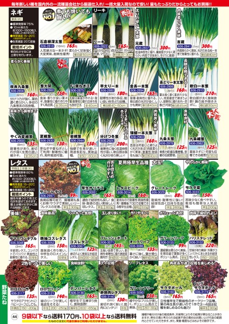 毎年新しい種を国内外の一流種苗会社から厳選仕入れ!一括大量入荷なので安い!量もたっぷりだからとってもお買得!!肉質柔らかく美味太りの早い一本葱ネギ葉長(約)激安ネギ昨年人気煮ても焼いても旨い!リーキイメージ石倉根深太葱606-2818人気絶大な一本ネギ!柔らかく甘味強く大変美味。耐病性優秀!軟白部50cm165円(10ml)リーキ606-2822クセがなく甘い西洋ねぎ!ポトフや酢豚、マリネに。軟白部20〜30cm165円(5ml)元蔵606-2837低温伸長性に優れ、繊維質が少なく柔らかい肉質で甘味あり。冬どりに最適!300円(7ml)吉蔵606-2841肉質軟らかく美味。光沢のある純一本葱で耐暑性に優れる。軟白部40cm300円(7ml)軟白一本葱606-2910(8ml)210円軟白部が太く食味抜群!鍋の具や焼きネギに。軟白部30cm長期収穫できる!長どり一本太葱606-2906(8ml)160円葉は長く厚く茎折れ少ない。肉質緻密で締まりよい。耐寒性に優れ年内〜早春どり可能!軟白部45cm金長一本葱606-2894(8ml)165円耐暑・耐病性に優れる。軟白部の光沢が良く、しかも美味!軟白部40cmイメージ九条細葱606-2982食味良好肉質良く美味!早太り一本606-2880(8ml)180円耐寒性があり多収。揃い良い秋冬どり品種。軟白部40〜50cm2〜3本に分げつする冬どりネギ分げつ冬葱606-2925(8ml)200円耐寒性に強く低温伸長性が高い。軟白部は長く光沢があり美しい!強健一本太葱606-2963(8ml)160円首部は衿揃いと締りよく光沢がある。肉質柔らかく美味。耐暑性・耐病性も強い。軟白部40cm九条太葱606-2978(8ml)125円伸長力旺盛な豊産種。京都の伝統野菜。全60cm(8ml)125円薬味ネギに!何度も収穫できる細葱!全35cm夏用極早生品種大玉!やわらかく美味!苦さ控えめ作りやすい!夏細葱606-2930(10ml)130円芽ねぎや夏ねぎとして利用!耐寒性に優れ、周年栽培可能。岩槻葱606-2944(8ml)150円強健で生育が速い!用途多彩な、美味品種。全50〜60cm激安レタス昨年人気昨早生サリナス606-300099円(1.5ml)サニーレタス606-2997長期収穫可能で、播種期も長くお得!サラダで美味しいリーフレタスの定番。300g食味最高!シャキッと食感!早生(2ml)165円濃色で結球性も良し!食味・食感の良い美味しい球レタス。300g早生レタスピーク606-3014(3ml)160円夏用なので耐暑性・晩抽性優秀!播種後70日で収穫できる極早生品種。500g極早生グレートレーク606-3029(3ml)88円耐病性・耐寒性に強い!結球性良く日持ち性抜群!800g中生サラダ菜606-3033(5ml)150円苦味少なく食べやすい。栽培も簡単な人気品種。100g早生玉しまり良い!作りやすい!ボリューム満点!肉厚で歯切れよし!改良九条葱606-2856(8ml)160円分けつ力が強く、葉色濃く柔らかい。多収の九条葱系の改良種。薬味から鍋物まで葱大関606-2860(10ml)150円食味・香りが良い葉ネギ。耐暑性に優れ作りやすく高品質。全35cmF1葉ねぎ王606-2875(8ml)200円手軽に薬味が作れる!耐暑・耐寒性に優れ日持ち性も良好です。全40cm晩抽コスレタス606-3052(2ml)150円食味良く作り易い、中早生のロメインレタス。中早生コスレタス606-3067(1.5ml)125円歯切れよく美味な半結球レタス。200〜300g食味抜群!中生フレッシュポート606-3071(3ml)145円玉揃い抜群で美しい。耐病性・耐寒性に優れ家庭菜園向き!500〜600g次々収穫!早生オークリーフ606-3086(4ml)135円暑さに強く、葉が柔らかく旨い!極早生250gリーフレタスグリーンリーフ606-3155(1ml)パリスタレッド606-3102(30粒)99円濃緑葉は柔らかく美味。生育旺盛で葉数が多くボリューム満点。早生220円甘味があり美味!外葉がコンパクトにまとまる半結球性レタス。150〜200g再成長が速く収穫を楽しめる!2色セットで美しい449袋以下なら送料170円、10袋以上なら送料無料たねのご注文に代金引換はご利用いただけません。播種や植え付け後の栽培条件、天候等によりその結果が異なることがありますが、弊社の責と考えられる結果不良の責めはお買い上げ代金の範囲内とさせていただきます。また、果重・糖度などはおよその数字です。サラダボール606-3160レッドサラダボール606-3174(3ml)165円(3ml)165円立性極早生で晩抽性のオークリーフ品種。葉の再生長が速いので1作で3〜4回は収穫を楽しめるのも魅力!300g極早生ロログリーン606-3121(2ml)140円緑のリーフが美しく食欲をそそる!中生200〜250gデンバーレタス606-3136(2ml)165円極早生で玉締まり良く、食味抜群!極早生600〜650g赤焼肉レタス606-3140(3ml)130円歯切れ良く旨い!焼肉にピッタリ!中生グリーンフリー606-3090(3ml)130円細やかなフリルが美しく、ボリューム満点で美味。250〜300g中生ロロロッサ606-3117(2ml)135円サラダのアクセントに!ベビーリーフとしても。中晩生150〜200g野菜たね●標準発芽率75%●10mlあたりネギ約1000〜1500粒入※品種により差があります。●発芽適温:15〜20℃※適温を保ちましょう。●生育適温:20℃前後栽培ポイント軟白化させるには土寄せを行います。柔らかく美味やくみ夏細葱606-2959(8ml)135円耐暑性があり、歯切れが良く生育の速い細ネギ。全35cmレタス早晩生球重(約)●標準発芽率80%●5mlあたり約1500〜2000粒入※品種により差があります。●発芽適温:15〜20℃※適温を保ちましょう。●生育適温:15〜20℃栽培ポイント酸性を嫌うので用土に