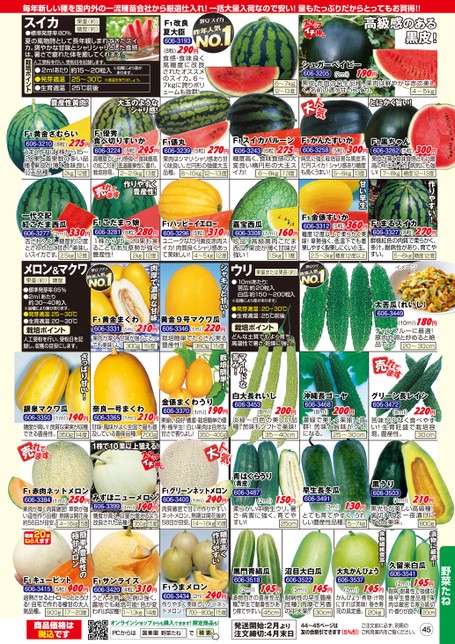 高級感のある黒皮!シュガーベイビー606-3205黒皮・赤肉の早生品種。果肉は鮮やかな赤で美しく、名前の通り甘いスイカ。4〜5kg190円(2ml)6〜7kg12〜13度とにかく旨い!F1俵丸606-3239(5粒)270円果肉はシマリ・シャリ感あり甘く味良い。だ円形の強健大玉品種。8〜10kg12〜13度F1スイカバルーン606-3243(6粒)275円糖度高く、食味食感の大変良い楕円形の大玉スイカ!6〜8kg13度F1かんたすいか606-3258(5粒)300円病気に強く栽培容易な黒皮系だ円スイカ!シャリ感あり糖度も高くうまい!5〜6kg13度F1黒ちゃん606-3262(5粒)300円果皮が薄く食味食感ともに最高の中玉スイカ!病気にも強い!糖度12〜13度7〜8kg激安スイカ昨年人気昨人290円F1改良夏大臣606-3193(8粒)食感・食味良く高糖度に改良されたオススメのスイカ。6〜7kgに誇りボリュームも抜群!イメージ豊産性黄肉!大玉のようなシャリ感!F1黄金さむらい606-3210(8粒)275円うまく作れば1株から15〜20果と着果数の多い品種!果皮が薄く食味良い小玉品種。2kg12度F1優秀食べ切りすいか606-3224(8粒)245円高糖度でシャリ感強く、食味最高の紅こだま!低温着果性に優れ、栽培容易。2〜2.5kg13度作りやすく豊産性!人工受粉を行い、受粉日を記録します。●2mlあたり●発芽適温●生育適温約15〜20粒入25〜30℃※適温を保ちましょう。25℃前後※品種により差があります。栽培ポイントスイカ果重(約)糖度(約)●標準発芽率80%夏の風物詩として長年親しまれてきたスイカ。爽やかな甘味とシャリシャリとした食感は、暑さで疲れた体を癒してくれます。毎年新しい種を国内外の一流種苗会社から厳選仕入れ!一括大量入荷なので安い!量もたっぷりだからとってもお買得!!沖縄長ゴーヤ606-3468(8ml)200円濃緑で美しく果揃い抜群!苦味と旨味がクセになる。25〜30cmグリーン長レイシ606-3472(8ml)220円苦味が少なく食べやすい!生育旺盛で栽培容易。豊産性。30cmマイルドな苦み!栽培簡単!金俵まくわうり606-3370(1ml)190円果揃い良好・豊産・栽培簡単の優秀・極早生!白い果肉は自然な甘さで香りよし!350〜400g白大長れいし606-3453(8ml)200円淡緑〜白色の美しい品種。苦味もソフトで美味!35〜40cm作りやすい!F1まるスイカ606-3327(8粒)270円鮮桃紅色の肉質で柔らかく、多汁。耐病性があり、育てやすい。5〜6kg糖度12度イメージ太苦瓜(れいし)606-3449(10ml)180円チャンプルーに最適!豚肉や卵と炒めると絶品です。20〜30cm甘い早生F1金俵すいか606-3312(5粒)360円糖度12度以上で柔らかく美味!草勢強く、低温下でも着果しやすく裂果しにくい小玉。.2〜3kg糖度12度以上激安ウリ昨年人気気F1こだまっ娘606-3281(8粒)280円1株から15〜20果も実ることもあり草勢が強く豊産性!2kg12度(5粒)F1ハッピーイエロー310円606-3296ユニークなだ円黄皮赤肉スイカ!肉質良くシャリ感あって美味しい!4〜5kg12度嘉宝西瓜606-3308(1ml)160円珍品!高級黄肉こだま西瓜。果皮が薄く甘味が強い!1.5kg11度ウリ果重または果長(約)●10mlあたり:苦瓜:約20粒入白瓜:約150〜200粒入※品種により差があります。●発芽適温:20〜30℃●生育適温:25℃前後栽培ポイントどんな土質でもよく育ち、高温性で暑さ・乾燥に強い。シャキッと甘い!黄金9号マクワ瓜606-3346(1ml)220円栽培簡単でたくさん実る豊産性!380g15度肉厚で濃厚な甘味F1黄金まくわ606-3331(1ml)210円果肉が厚く、甘味が強くてとっても美味しい!300g15度激安マクワ昨年人気一代交配紅こだま西瓜606-3277(2ml)330円舌ざわりよく、糖度約12度とさわやかに甘い!美味しいスイカです。2.5kg12度メロン&マクワ果重(約)糖度●標準発芽率85%●2mlあたり約30〜40粒入※品種により差があります。●発芽適温:25〜30℃●生育適温:20〜30℃さっぱり甘い!栽培ポイント人工受粉を行い、受粉日を記録し、収穫の目安にします。銀泉マクワ瓜606-3350(1ml)140円糖度が高い!良質な果実が収穫できる豊産性。350g14度奈良一号まくわ606-3365(1ml)210円甘味・風味がよく全国で最も普及している豊産品種。700g1株で10果以上狙える!F1赤肉ネットメロン606-3384(1ml)250円果肉が厚く肉質緻密!草勢が強い這性作り品種!熟期は開花後約56日が目安。4〜1.6kg15度1.みずほニューメロン606-3399(1ml)140円糖度が高く、収量が増えるよう改良された品種!350g15度F1グリーンネットメロン606-3400(1ml)240円肉質緻密で甘い。作りやすいネットメロン。熟期は開花後約58日が目安。1.〜1.kg16度青はぐらうり(青皮)606-3487(2ml)150円柔らかい中晩生ウリ。暑さ・病害に強く、育てやすい!25cm早生長冬瓜606-3491(3ml)130円とても育てやすく、うれしい豊産性品種。5〜7kg黒うり606-3503(1ml)210円黒光りが美しい高級種!歯切れ良く一夜漬けにすると美味。800g漬物に最適!野菜たね久留米白瓜606-3541(2ml)145円耐病・耐暑性で強健な極早生豊産品種。果肉は緻密で厚く歯切れ・香りが良い!20cm食物繊維豊富!大丸かんぴょう606-3537黒門青縞瓜606-3518沼目大白瓜606-3522(2ml)145円漬物向きの豊産性品種。早生で耐暑性があり育てやすい。45cm(3ml)145円耐病性の早生豊産性種。肉厚で芳香の中大果。30cm(3ml)145円かんぴょう・煮物・汁物にすれば美味!巻き寿司の具定番。20kg糖度高く作りやすい(4粒)310円F1サンライズ606-3420うどん