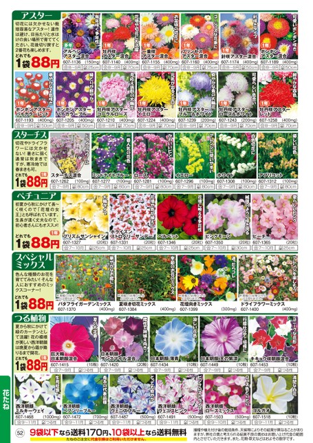 切花には欠かせない栽培容易なアスター!連作は避け、日当たりと水はけの良い場所で育ててください。花後切り戻すと2番花も楽しめます。どれでも1袋88円多年アルペンアスター混合607-11368〜9月(150mg)25cm1年牡丹咲アスター混合607-11408〜9月(400mg)70cm1年一重咲アスター混合607-11558〜9月(400mg)70cm1年プリンセスアスター混合607-11608〜9月(400mg)75cm1年針咲アスター混合607-11748〜9月(400mg)50cm1年ポンポンアスター混合607-11898〜9月(400mg)50cm1年ポンポンアスターバイカラーレッド607-11938〜9月(400mg)50cm1年ポンポンアスターバイカラーブルー607-12058〜9月(400mg)50cm1年牡丹咲アスターコーラルローズ607-12108〜9月(400mg)70cm1年牡丹咲アスターイエロー607-12248〜9月(400mg)70cm1年牡丹咲アスターブルー&ホワイト607-12398〜9月(200mg)70cm1年牡丹咲アスターローズ&ホワイト607-12438〜9月(200mg)70cm1年牡丹咲アスターレッド607-12588〜9月(400mg)70cm切花やドライフラワーには欠かせない!暑さに弱く通常は秋まきですが、寒冷地では春まきも可。1年どれでも1袋88円スターチス混合607-12627〜9月(100mg)80cmミッドナイトブルー607-12777〜9月(100mg)80cmローズ607-12817〜9月イエロー607-12967〜9月(100mg)80cmホワイト607-13087〜9月アプリコット607-13127〜9月(100mg)80cm(100mg)80cm(100mg)80cm初夏から秋にかけて長〜く咲くので「花壇の女王」とも呼ばれています。生長が速く丈夫なので、初心者さんにもオススメ!1年どれでも1袋88円プリズムサンシャイン607-1327(20粒)7〜10月25cmホライズンストロベリーサンデー607-1331(20粒)7〜10月25cmベルベット607-13467〜10月(20粒)25cmピンクモーン607-13507〜10月ピーチ607-13657〜10月(20粒)30cm(20粒)25cm色んな種類のお花を育ててみたい!そんな人におすすめのミックスコーナー!どれでも1袋88円※掲載の品種が入るとは限りません。バタフライガーデンミックス607-1370(400mg)※掲載の品種が入るとは限りません。夏咲き切花ミックス607-1384※掲載の品種が入るとは限りません。花壇向きミックス607-1399(400mg)(300mg)※掲載の品種が入るとは限りません。ドライフラワーミックス607-1400(400mg)夏から秋にかけて緑のカーテンとして活躍!花の模様が美しい西洋朝顔は晩夏から霜が降りるまで開花。1年どれでも1袋88円巨大輪日本朝顔混合607-14157〜9月(15粒)つる性日本朝顔サンスマイル混合607-14207〜9月(20粒)つる性日本朝顔薄青607-14347〜9月(10粒)つる性日本朝顔天の紫涼607-14497〜9月(10粒)つる性キキョウ咲朝顔混合607-14537〜9月(10粒)つる性529袋以下なら送料170円、10袋以上なら送料無料たねのご注文に代金引換はご利用いただけません。播種や植え付け後の栽培条件、天候等によりその結果が異なることがありますが、弊社の責と考えられる結果不良の責めはお買い上げ代金の範囲内とさせていただきます。また、花期・草丈などはおよその数字です。西洋朝顔ヘブンリーブルー607-14729〜11月(700mg)つる性西洋朝顔ヴェニスブルー607-14879〜11月(500mg)つる性西洋朝顔ヴェニスピンク607-14919〜11月(500mg)つる性西洋朝顔ローズミックス607-15039〜10月ヨルガオ607-15189〜11月(500mg)つる性(10粒)つる性西洋朝顔ミルキーウェイ607-14689〜11月(1000mg)つる性花たね
