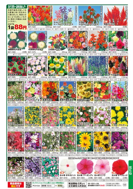 花壇や庭先が寂しくなる夏場に咲く花を中心に揃えました。他店にはないような珍しいものも!是非この機会にお試しください。どれでも1袋88円1年槍けいとう混合607-15227〜10月(200mg)30〜50cm1年サルビアマーブルアーチミックス607-15377〜10月(20粒)40cm1年千日紅ストロベリーフィールズ607-15417〜10月(300mg)60cm1年羽毛けいとう607-15567〜10月(60粒)50cm1年縮緬葉牡丹混合607-156011〜2月(30粒)1年丸葉葉牡丹混合607-157511〜2月(30粒)1年夏咲福寿草607-16255〜6月多年昼咲月見草607-16305〜7月(2000mg)40cm(200mg)40cm1年三色葉げいとう607-15807〜10月(80mg)100cm1年八重咲マツバボタン混合607-15947〜8月(100mg)這い性1年サルビアホットジャズ607-16066〜9月(150mg)70cm1年タチアオイマジョレットミックス607-16105〜7月(300mg)80cm1年アンモビューム607-16446〜10月(300mg)50cm1年ラッセルルピナス混合607-01614〜6月(400mg)100cm1年ブルーサルビア607-16596〜9月(150mg)50cm1年サルビア混合607-16636〜9月(100mg)25cm1年金蓮花ハワイアンミックス607-1728(2500mg)40cm6〜11月1年タチアオイ一重咲607-17325〜7月(300mg)150cm1年ラバテラ混合607-17906〜10月(300mg)65cm1年イエローサルタン607-18014〜8月(500mg)60cm1年ルドベキアスプートニク607-18696〜10月(150mg)75cm1年バーベナミックス607-18735〜10月(200mg)20cm花たね1年日々草ダークレッド607-1942(20粒)20cm6〜10月1年日々草ピンク607-19386〜10月(20粒)20cm1年オシロイバナマーブルミックス607-1682(1000mg)40cm6〜10月1年金蓮花混合607-16976〜11月(2500mg)つる性1年金蓮花矮性混合607-17096〜11月(2500mg)40cm1年金蓮花クリーム607-1713(2500mg)40cm6〜10月1年メランポディウム607-17516〜10月(100mg)30cm1年イベリスドワーフミックス607-18206〜10月(500mg)25cm1年フロックスシュガースター607-18926〜8月(200mg)40〜60cm1年コリウス607-17667〜10月(100mg)40cm多年黄花アリッサム607-17704〜5月(200mg)40cm1年インパチェンスベイビーミックス607-17856〜10月(100mg)20cm1年フラックスホワイト607-1835(400mg)6〜8月45cm1年フラックスレッド607-18406〜8月(500mg)45cm1年ルドベキアマーマレード607-18546〜10月(100mg)40cm1年日々草混合607-19047〜11月(100mg)25cm1年日々草ポルカドット607-1919(20粒)20cm6〜10月1年日々草バーガンディ607-1923(20粒)20cm6〜10月オンラインショップからも購入できます!限定商品も!PCからは花たね発送開始:2月より注文締切:4月末日52〜53ページは友の会割引できます(5%引)ご注文前に必ず、別冊のご利用案内をご覧ください。531年ニコチアナ混合607-16785〜10月(300mg)30〜100cm1年クレオメカラーファウンテン607-1747(400mg)7〜9月100cm1年赤葉ゲイトウ607-18166〜10月(200mg)20cm1年ヘリプテラム混合607-18883〜5月(200mg)50cm商品価格は税込です