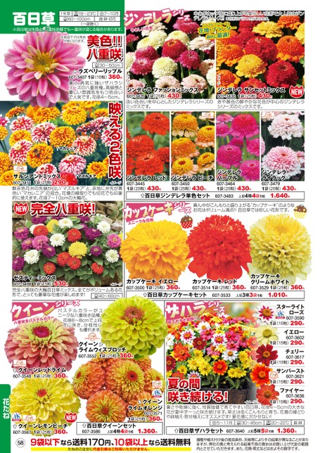 美色!!ジンデレラファッションミックス607-3426淡い色合いを中心としたジンデレラシリーズのミックスです。1袋(25粒)430円ジンデレラサンセットミックス607-3430赤や黄色の鮮やかな花色が中心のジンデレラシリーズのミックスです。1袋(25粒)430円イメージイメージ30〜50cmラズベリーリップル607-34071袋(15粒)360円暑さ・病気に強いザハラシリーズの八重咲種。高級感と優しい雰囲気をもつ色合いで人気です。花径4〜5cm。↑マカレニア百日草1年草18〜23℃60〜100cm7〜10月庭・鉢・切花※百日草は性質上、八重咲品種でも一重咲が混じる場合があります。※高温下では発色が弱くなります。美色!!ジンデレラやさしい花色シリーズ中心がカップ状に盛り上がる愛らしい花形で大人気のジンデレラシリーズ!!※花形はバラつきがあります。シンデレラシリーズは花壇・プランター栽培に最適!ジンデレラレッド607-34451袋(25粒)430円ジンデレラピーチ607-34501袋(25粒)430円ジンデレラパープル607-3464ジンデレラライラック607-34791袋(25粒)430円1袋(25粒)430円百日草ジンデレラ単色セット607-3483上記4種4袋1組1,640円真ん中がこんもりと盛り上がる“カップケーキ”のようなお花はボリューム満点!!百日草では珍しい花形です。カップケーキシリーズユニークな花形カップケーキイエロー607-35001袋(25粒)360円カップケーキレッド607-35141袋(25粒)360円百日草カップケーキセット607-3533上記3種3袋1組1,010円カップケーキクリームホワイト607-35291袋(25粒)360円ザハラシリ育てやすさ抜群!!ーズ↑マズルキア1袋(25粒)290円サルシアンドミックス607-3411鮮赤色花弁の先端が白い“マズルキア”と、赤地に弁先が黄色い“マカレニア”の混合。花壇の縁取りでも切花でも印象的に使えます。花径7〜10cmの大輪花。イメージゼスティーミックス607-3498完全八重咲の大輪百日草ミックス。全てがボリュームある花形で、とっても豪華な花壇が楽しめます!1袋(15粒)530円イメージ40〜60cmクイーンシリーズ八重咲きパステルカラーパステルカラーがユニークな八重咲き品種。花径6〜8cmで上向きに咲き、分枝性にも優れます。クイーンライムウィズブロッチ607-35521袋(25粒)360円スターライトローズ607-35901袋(15粒)290円イエロー607-36021袋(15粒)290円チェリー607-36171袋(15粒)290円サンバースト607-36211袋(15粒)290円ファイヤー607-3636クイーンライムオレンジ607-35711袋(25粒)360円1袋(15粒)290円暑さや乾燥に強く、性質強健で育てやすい百日草。花径4〜5cmの大きな花が夏中ずーっと咲き続けます。草丈は低くこんもりと育ち、花壇の縁どりや鉢植え・寄せ植えにオススメです!夏花壇に欠かせない!イメージ5〜11月30〜45cm20〜22℃庭・鉢百日草クイーンセット607-3586上記4種4袋1組1,360円百日草ザハラセット607-3640上記5種5袋1組1,360円589袋以下なら送料170円、10袋以上なら送料無料たねのご注文に代金引換はご利用いただけません。播種や植え付け後の栽培条件、天候等によりその結果が異なることがありますが、弊社の責と考えられる結果不良の責めはお買い上げ代金の範囲内とさせていただきます。また、花期・草丈などはおよその数字です。クイーンレッドライム1袋(25粒)360円607-3548花たねクイーンレモンピーチ1袋(25粒)360円607-3567