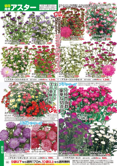 プチシリーズ花径約3.5cmの超小輪の八重咲きアスター。分枝性がありピンチ栽培をして、ボリュームのある切花に!!切花向きアスター1年草15〜25℃50〜70cm(一部除く)7〜8月庭・鉢・切花ココットシリーズは花径2〜3.5cmの小輪で、かわいいフリル咲きアスター。花もちが良いので長い間楽しむことができます。60〜100cmココットレッド1袋(20粒)330円※607-4057ココットマーブルレッド1袋(20粒)330円品種登録出願中607-4061新しい花形の美形アスターbbzsdl\Rココットスカイ607-40191袋(20粒)330円※ココットナイト607-40041袋(20粒)330円※ココットピンク1袋(20粒)330円※607-4023ココットシャインレッド607-40381袋(20粒)330円※ココットホワイト607-40761袋(20粒)330円※ココットチェリー607-40801袋(20粒)330円※アスターココットAセット607-4042上記4種4袋1組1,240円アスターココットBセット607-4095上記4種4袋1組1,240円分枝性抜群豪華な切花に!キュートな半八重極小輪プチローズ607-41451袋(25粒)330円ステラミックス70〜80cm607-4107花径約3cmの半八重極小輪花が、とってもキュート!摘芯しなくても自然と分枝する多花性品種なので、栽培も簡単です。庭や鉢植え、アレンジにも最適!1袋(40粒)400円リボンシリーズカラフルアスター!!15〜20cmイメージ609袋以下なら送料170円、10袋以上なら送料無料たねのご注文に代金引換はご利用いただけません。播種や植え付け後の栽培条件、天候等によりその結果が異なることがありますが、弊社の責と考えられる結果不良の責めはお買い上げ代金の範囲内とさせていただきます。また、花期・草丈などはおよその数字です。プチパープル607-41501袋(25粒)330円プチアスターセット607-4179プチホワイト607-41641袋(25粒)330円上記3種3袋1組920円607-4111リボンブルー1袋(25粒)330円リボンレッド607-41261袋(25粒)330円花弁の縁に白色が入る珍しい2色咲きのアスター。草丈が15〜20cmで鉢植えや、花壇の縁などで大活躍。アスターリボンセット607-4130上記2種2袋1組590円花たね