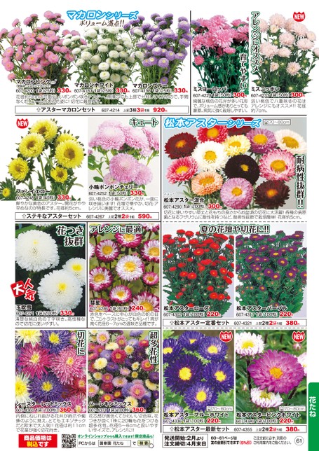 キュート松本アスターシリーズ70〜80cmアレンジにオススメ育てやすいミスヨーロッパ1袋(50粒)300円607-4229綺麗な桃色の花弁が多い花形で、ボリューム感がありとっても豪華。病気に強く栽培しやすい。ミスニッポン1袋(50粒)300円607-4233淡い桃色で八重咲きの花はアレンジにもオススメ!!花径約7cm。マカロンシリーズボリューム満点!!マカロンピンク(登録名:ミヨアスマカピンク)※1袋(25粒)330円1袋(25粒)330円607-4200花径約5cmの可愛らしいポンポン咲きアスター。無摘芯でも上部で分枝してくれるので、手間なくボリュームのある花姿に!切花に最高です。1袋(25粒)330円マカロンホワイト607-4183マカロンブルー607-4198アスターマカロンセット607-4214上記3種3袋1組920円耐病性抜群!!イメージ松本アスター混合607-4290切花に使いやすい草丈と花もちの良さからお盆頃の切花に大活躍!各種の病原菌となるフザリウムに耐性を持つなど、耐病性抜群で栽培簡単!花径約5cm。1袋(200粒)300円夏の花壇や切花に!!松本アスターローズ607-43021袋(100粒)220円松本アスター定番セット607-4321松本アスターパープル607-43171袋(100粒)220円上記2種2袋1組380円1袋(40粒)330円ファンイエロー607-4248鮮やかな黄色のアスター。開花がやや早めなのが特長です。花径約5cm。ステキなアスターセット花つき抜群1袋(50粒)330円小輪ポンポンチェリー607-4252淡い桃色の小輪ポンポン花が、一面に咲き揃います!花壇で華やか、切花・アレンジに美麗でオススメ。607-4267上記2種2袋1組590円アレンジに最適超多花性切花に玉吹雪607-4271清楚な純白色の丁字咲き。高性種なので切花に使いやすい。1袋(200粒)330円1袋(40粒)240円彗星607-4286赤色をベースに中心が白色の蛇の目で、コントラストがとってもキレイ!背が高く花径6〜7cmの遅咲き品種です。イメージ1袋(100粒)360円ハーレキンミックス607-4374花芯部が黄色くてかわいい2色咲。花つきが良く1株に20輪も花をつける超多花性。花径5〜6cmと扱いやすいサイズで、アレンジに!!イメージシースターレットミックス1袋(100粒)360円607-4360内側にねじれ曲がる花弁が鉤爪や蜘蛛のように見え、とてもエキゾチックだと欧米で大人気!!花径は約11cmで花茎が強く切花向き。花たね70〜80cm松本アスターブルーホワイト607-43361袋(100粒)220円松本アスター最新セット607-435570〜80cm松本アスターピンクホワイト607-43401袋(100粒)220円上記2種2袋1組380円商品価格は税込ですオンラインショップからも購入できます!限定商品も!PCからは花たね発送開始:2月より注文締切:4月末日60〜61ページは友の会割引できます(5%引)ご注文前に必ず、別冊のご利用案内をご覧ください。61