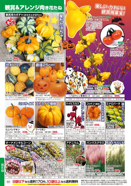 楽しい・かわいい観賞用果実!とげなしつのなすソラナム300円607-52501袋(25粒)キツネの顔のようなユニークな実が可愛くて、子供たちにも大人気!!別名「フォックスフェイス」。ソラナム607-52651袋(20粒)440円その名の通り、かぼちゃそっくりの赤い実が可愛い!星形かぼちゃイメージハロウィンの飾りにも観賞&アレンジ向き花たね※果実や葉は観賞用なので、食べられません。万一、食された場合の責任は負いかねます。観賞用カボチャ(おもちゃかぼちゃ)珍しい星のような形を中心とした、観賞用かぼちゃのミックスです。直径25cm!イメージスターミックス607-52081袋(5粒)発送開始:3月中旬より440円かわいいアレンジ例990円カメレオン観賞用トウガラシ300円1袋(25粒)607-5270一枝から白・黄・橙・赤・紫の宝石のような実をつける楽しいトウガラシ。上記3種3袋1組607-5284ハロウィン果実セット1年草9〜11月50〜100cm20〜25℃庭・鉢・切枝スモールフルーツミックス607-5212小〜中サイズの観賞用かぼちゃ。まるで小さなおもちゃのよう。1袋(10粒)190円1袋(5粒)440円607-5227直径約25cmで、目鼻や口をくりぬけば、名前の通りハロウィンにぴったり!緑のカーテンにミナロバータふわふわ天然綿コットン(綿花)秋のアレンジにミニサイズストライプ模様ハイビスカス発送開始:2月中旬より発送開始:3月中旬より1袋(5粒)330円607-5231直径10〜15cmのオレンジ果実。くびれが特徴の可愛いパンプキン。1袋(5粒)300円607-5246黄色と白のストライプ模様がステキ!アレンジに重宝します。1年草8〜10月つる性18〜22℃庭・鉢607-52991袋(10粒)540円花を楽しんだ後は枝を切花アレンジに!夏は着果しにくくなります。1年草2m20〜25℃9〜11月庭・鉢・切枝607-53001袋(25粒)550円ふわふわのコットンボールが枝いっぱいに!切枝も良し、綿を収穫するも良し。低木で栽培簡単!50〜100cm10〜11月1年草庭・鉢・切枝20〜30℃607-53151袋(30粒)280円緋色から白色に徐々に花色が変化する!生育旺盛で緑のカーテンにも。つる性9〜11月庭・鉢20〜25℃1年草パンパスグラス和洋どちらにもユニークアデニウムイメージオーナメンタルコーン※スイートコーンの近くには植えないでください。8〜10月2m25〜30℃庭・鉢1年草649袋以下なら送料170円、10袋以上なら送料無料たねのご注文に代金引換はご利用いただけません。播種や植え付け後の栽培条件、天候等によりその結果が異なることがありますが、弊社の責と考えられる結果不良の責めはお買い上げ代金の範囲内とさせていただきます。また、花期・草丈などはおよその数字です。607-53341袋(10粒)550円株元がぷっくり膨らむユニークな多肉植物。砂漠のバラ」と呼ばれ日当たりが良く乾燥した環境を好む。鉢50〜100cm常緑低木春〜秋25℃607-53491袋(80粒)270円大型になるパンパスグラス。和・洋どちらのアレンジでも大活躍し、切花に最適!!超強健で育てやすい。庭・鉢・切花607-53531袋(80粒)270円8〜10月グラスジェムコーンセレクト607-53201袋(30粒)880円グラスジェムコーンとは、ネイティブアメリカンが育種した、宝石のような美しい虹色の実をつける、世にも不思議なトウモロコシ!独特の色彩と収穫時期から、ハロウィンの飾り付けなどに人気があり、ドライフラワーに重宝されています。アレンジ例ロコシに輝くトウモ色虹花たね