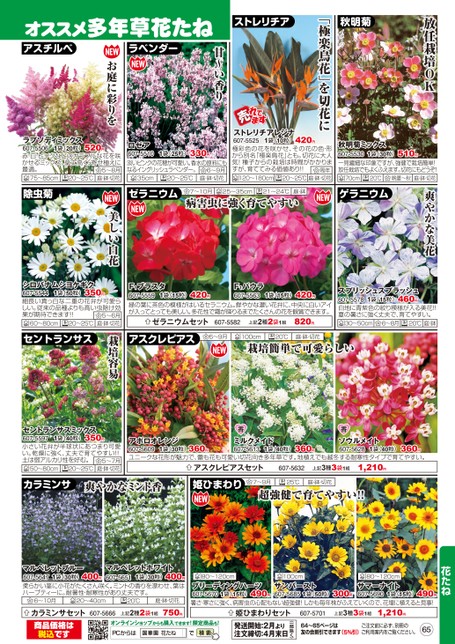 放任栽培OK秋明菊イメージ1袋(30粒)秋明菊ミックス607-5530一見繊細な印象ですが、強健で栽培簡単!放任栽培でもよくふえます。切花にもどうぞ!庭・鉢・切花510円晩夏〜秋70cm20℃爽やかな美花ゲラニウム「極楽鳥花」を切花にストレリチア甘〜い香りオススメ多年草花たねアスチルベラベンダーお庭に彩りをラプソディミックス607-55061袋(20粒)赤・白・ピンクなどのカラフルな花を咲かせるミックス。草丈高く、寄せ植えに最適。5〜8月庭・鉢・切花520円75〜85cm20〜25℃1袋(25粒)ロゼア607-5510淡いピンクの花穂が可愛い。香水の原料にもなるイングリッシュラベンダー。6〜9月庭・鉢・切花330円20〜25℃35cm420円ストレリチアレジナ607-55251袋(10粒)極彩色の花を咲かせ、その花の色・形から別名「極楽鳥花」とも。切花に大人気!種子からの栽培は時間がかかりますが、育ててみる価値あり!!周年庭・鉢・切花120〜180cm20〜25℃7〜10月25〜35cm21〜24℃庭・鉢病害虫に強く育てやすい美しい白花除虫菊ゼラニウム1袋(50粒)シロバナムシヨケギク607-5544細長い真っ白な二重の花弁が可愛らしい。従来の品種よりも高い虫除け効果が期待できます!!5〜6月庭・鉢・切花350円60〜80cm20〜25℃F₁ブラスタ607-5559緑の葉に茶色の模様がはいるセラニウム。鮮やかな濃い花弁に、中央に白いアイが入ってとっても美しい。多花性で霜が降りるまでたくさんの花を観賞できます。F₁パウラ607-55631袋(15粒)1袋(15粒)420円420円ゼラニウムセット607-5582上記2種2袋1組820円1袋(15粒)スプリッシュスプラッシュ460円607-5578白地に青紫色の絞り模様が入る美花!!夏の暑さに強く丈夫で、育てやすい。庭・鉢30〜50cm6〜8月20℃1袋(40粒)セントランサスミックス607-5597小さい花弁が半球状にあつまり可愛い。乾燥に強く、丈夫で育てやすい!!土は弱アルカリ性を好む。5〜7月20〜25℃庭・鉢・切花350円50〜80cmアポロオレンジ607-5609ユニークな花形が魅力で、蕾も花も可愛い切花向き多年草です。地植えでも越冬する耐寒性タイプで育てやすい。ソウルメイト607-5628ミルクメイド607-56131袋(40粒)1袋(30粒)1袋(40粒)360円360円360円アスクレピアスセット607-5632上記3種3袋1組1,210円カラミンサ爽やかなミント香姫ひまわり7〜9月25℃庭・鉢・切花超強健で育てやすい!!アスクレピアス6〜9月100cm20℃庭・鉢・切花栽培簡単で可愛らしい栽培容易セントランサス607-5701上記3種3袋1組1,210円64〜65ページは友の会割引できます(5%引)ご注文前に必ず、別冊のご利用案内をご覧ください。65(一部除く)姫ひまわりセット発送開始:2月より注文締切:4月末日607-5666上記2種2袋1組750円オンラインショップからも購入できます!限定商品も!PCからは花たね花たね80〜120cm100cmブリーディングハーツ490円607-5670暑さ・寒さに強く、病害虫の心配もない超強健!しかも毎年株がふえていくので、花壇に植えると見事!サンバースト607-56851袋(15粒)1袋(50粒)1袋(15粒)300円490円80〜120cmサマーナイト607-5690マルベレットブルー400円1袋(30粒)607-5647柔らかい茎に小花がたくさん咲く。ミントの香りを漂わせ、葉はハーブティーに。耐暑性・耐寒性があり丈夫です。マルベレットホワイト607-56511袋(30粒)400円20〜40cm20℃庭・鉢・切花6〜10月カラミンサセット商品価格は税込です