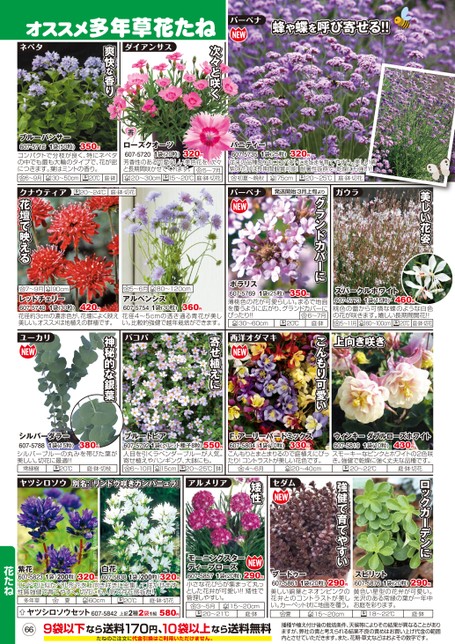 オススメ多年草花たねバーベナ蜂や蝶を呼び寄せる!!次々と咲くダイアンサス爽快な香りネペタ1袋(50粒)ブルーパンサー607-5716コンパクトで分枝が良く、特にネペタの中でも最も大輪のタイプで、花が密につきます。葉はミントの香り。20℃350円30〜50cm6〜9月庭・鉢1袋(20粒)ローズクオーツ607-5720芳香性のある可愛らしい美色花を、次々と長期間咲かせてくれます。5〜7月庭・鉢・切花15〜20℃320円20〜30cmバニティー607-5735従来の品種よりもコンパクトにまとまり育てやすい。美しい青紫の花弁は長期間観賞可能!耐暑性抜群で、乾燥にも強い!!1袋(25粒)320円初夏〜晩秋75cm20〜25℃庭・鉢・切花クナウティア20〜24℃庭・鉢・切花バーベナ発送開始:3月上旬より美しい花姿ガウラ1袋(15粒)スパークルホワイト607-5773桃色の蕾から可憐な蝶のような白色の花が咲きます。嬉しい長期間開花!!庭・鉢・切花460円60〜100cm5〜11月20℃グランドカバーにポラリス607-5769薄桃色の花が可愛らしい。まるで地面を覆うように広がり、グランドカバーにぴったり!!6〜7月1袋(25粒)350円30〜60cm20℃庭・鉢レッドチェリー607-5740花径約3cmの濃赤色が、花壇によく映え美しい。オススメは地植えの群植です。1袋(30粒)420円アルベンシス607-5754花径4〜5cmの透き通る青花が美しい。比較的強健で越年栽培ができます。1袋(30粒)360円7〜9月90cm5〜6月80〜120cm花壇で映えるロックガーデンに強健で育てやすい1袋(15粒)シルバーダラー607-5788シルバーブルーの丸みを帯びた葉が美しい。切花に最適!!20℃380円庭・鉢・切枝常緑樹1袋(ペレット種子8粒)ブルートピア550円607-5792人目を引くラベンダーブルーが人気。寄せ植えやハンギング、大鉢にも。20〜25℃6〜10月15cm鉢F₁アーリーバードミックス607-5804こんもりとまとまりるので庭植えにぴったり!コントラストが美しい花色です。1袋(10粒)330円ウィンキーダブルローズホワイト607-5819スモーキーなピンクとホワイトの2色咲き。強健で乾燥に強く丈夫な品種です。1袋(10粒)430円4〜6月20〜40cm20〜22℃庭・鉢・切花上向き咲きこんもり可愛い西洋オダマキ寄せ植えにバコパ神秘的な銀葉ユーカリセダム矮性ヤツシロソウ別名:『リンドウ咲きカンパニュラ』アルメリア1袋(20粒)ブードゥー290円607-5861美しい銅葉とネオンピンクの花弁とのコントラストが美しい。カーペット状に地面を覆う。1袋(20粒)スピリット607-5876黄色い星型の花弁が可愛い。光沢のある常緑の葉が一年中お庭を彩ります。290円夏15〜20cm18〜22℃庭・鉢播種や植え付け後の栽培条件、天候等によりその結果が異なることがありますが、弊社の責と考えられる結果不良の責めはお買い上げ代金の範囲内とさせていただきます。また、花期・草丈などはおよその数字です。669袋以下なら送料170円、10袋以上なら送料無料たねのご注文に代金引換はご利用いただけません。モーニングスターディープローズ290円607-5857小さな花びらが集まって丸っとした花弁が可愛い!!矮性で管理しやすい。1袋(20粒)3〜5月15〜20cm20〜21℃庭・鉢ヤツシロソウセット607-5842上記2種2袋1組580円多年草夏60cm20℃庭・鉢・切花紫花320円607-5823リンドウに似たベル形花を上向き咲きに密集して咲かせます。性質強健で育てやすく、切花にも人気で存在感抜群!白花607-58381袋(200粒)1袋(200粒)320円花たね