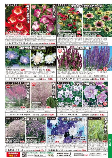 エキナセア特徴的な花形と花色が人気上品な花色蝶を引き寄せるペンステモンF₁アラベスクレッド607-58801袋(15粒)550円F₁アラベスクオーキッド550円607-58951袋(15粒)開花期が長く、従来のペンステモンよりも暑さに強く改良されたアラベスクシリーズ!!ベル型のバイカラー咲きの花弁が可愛くて人気です!!15〜20℃6〜10月(夏の高温期除く)60〜75cm庭・鉢・切花ペンステモンアラベスクセット607-5907上記2種2袋1組1,040円発送開始:3月中旬よりポリネーションミックス690円1袋(APEX種子10粒)607-5911大輪で繊細な花色。嬉しい初年度開花型!!分枝性に優れ、たくさん花をつける、カラフルなミックスです。※弁先の発色に個体差があります。1袋(20粒)グリーンツイスター607-5926咲き始めの緑から咲き進むにつれ中央部が桃色へと変化する、種子販売では珍しい花色のエキナセア!!570円6〜9月40〜70cm20〜22℃庭・鉢・切花ストケシア耐寒性抜群で栽培容易サルビア放任栽培OK!!ブルー607-59301袋(15粒)520円ホワイト607-59451袋(15粒)520円メルローローズ607-59641袋(20粒)320円メルローブルー607-59791袋(20粒)320円開花期が長く、暑さに強いため夏の花壇にオススメ。耐寒性強く屋外でも越冬可能。生育旺盛・分枝性抜群で育てやすい。細かい花弁が繊細で美しい。春から夏まで長く咲き続け、暑さ・寒さに強いスペルバシリーズ!!強健で育てやすく、ほとんど手間がかからないありがたい品種です。6〜9月30〜50cm15〜20℃ストケシアセット607-5950上記2種2袋1組庭・鉢・切花980円夏〜秋30〜50cm20〜25℃庭・鉢発送開始:2月下旬よりスペルバメルローセット607-5983上記2種2袋1組580円ムスクマロウ可愛い花色が人気アップルブロッサム607-60201袋(40粒)350円ピンク607-60341袋(40粒)350円淡い花色がとっても可愛く、他の花の引き立て役として大活躍。花付きよく、ドーム状にまとまります。ふわっと香るジャコウの香りが人気です。光沢ある緑葉330円70〜80cm50〜60cm鮮やかな花穂ミューレンベルギアルビー607-59981袋(20粒)風にそよぐ柔らかな穂が涼し気で人気のミューレンベルギア。1袋(20粒)330円ロージー607-60009〜10月20〜22℃庭・鉢・切花ミューレンベルギアセット607-6015上記2種2袋1組600円6〜9月50cmムスクマロウセット15〜20℃庭・鉢・切花607-6049上記2種2袋1組620円爽やかな香りレモングラス花たね1袋(15粒)レモングラス310円607-6118レモンのような爽やかな香気があります。乾燥させた葉をハーブティーなどで利用。収穫:春〜秋50〜100cm20〜25℃庭・鉢※品種として安定していないため、一重咲きになることがあります。66〜67ページは友の会割引できます(5%引)ご注文前に必ず、別冊のご利用案内をご覧ください。67(一部除く)発送開始:2月より注文締切:4月末日オンラインショップからも購入できます!限定商品も!PCからは花たね607-6072上記2種2袋1組620円八重咲きキキョウセット607-6103上記2種2袋1組520円宿根スターチスセット商品価格は税込ですイメージ宿根スターチス添え花に最適!キキョウ切り花で大人気!!50cm30〜60cmラティフォリウム350円1袋(40粒)607-6053耐暑・耐寒性があり、露地栽培でも夏越し可能な宿根スターチス!添え花として切花にしてもステキ。ハンガリカム607-60681袋(100粒)350円6〜8月15〜20℃庭・鉢・切花八重咲きキキョウ八重咲きキキョウパープルホワイト607-6087290円1袋(50粒)古くから愛されてきた桔梗の豪華な八重咲き!!二重だけでなく、幾重にも重なった花弁は文字通り八重になることも!!1袋(50粒)290円607-60916〜8月15〜20℃庭・鉢・切花