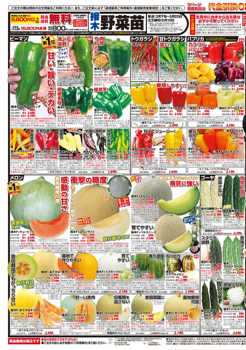 印の種苗は、農林水産省登録品種です。登録者(権利者)の許可なしに、採種・増殖・販売(譲渡)・輸出入等することはできません。※…海外持出禁止品種(公示(農水省HP)参照)印の種苗は、商標登録品種です。●写真の色合いは印刷の関係上、本来の色と多少異なる場合がありますので、あらかじめ天候等によりその結果が異なることがありますが、弊社の責と考えられる結果不良の責めきます。●全ての数値は目安です。地域・栽培環境などにより差が出ることがあります。●お届肉厚で旨い苦味少ない接木白願寿ゴーヤ615-14601株790円4株615-14932,780円超大型で人気の願寿苦瓜の白色種。苦味も少ないので、サラダにも好適です。果長30〜35cm果重700g人気!接木願寿苦瓜615-14172株990円8株615-14403,490円肉厚で苦味少なく、非常に美味しい大型ゴーヤ。大人気品種です!!果長25〜30cm果重500g苦味マイルド2,290円願寿苦瓜セット615-1510上記2種4株1組(各2株)スタミナ抜群接木マイルドゴーヤ615-15772株990円8株615-16083,490円明るい黄緑色で、苦味がマイルドで食べやすい!果長30cm果重500〜600g苦味少なめ長く収穫接木F1島豊615-15241株790円4株615-15582,780円果重平均800g以上にもなる巨大果。着果率が良く、なり疲れもなく長期収穫が可能。豊産性!果重800g接木パールゴーヤ(農林水産省登録品種登録名:MW-0201)615-16701株990円4株615-17003,490円白い丸形果。一般的なゴーヤと比べ苦味が少なめで食べやすい!!調理例果重300〜500g接木F1島娘615-16271株790円4株615-16502,780円節々に実る多収性!実つき制限なしでも疲れにくく、長期収穫可能。果長30cm果重250〜300gメチャ旨ゴーヤセット上記4種4株1組615-17202,690円栽培簡単なネットメロン病気に強い「バルコニーズ」の鉢植え栽培イメージ鉢植えでも楽しめる♪1株4株690円2,490円接木F1オルフェ615-0247615-0270うどんこ病・つる割病に強く、栽培しやすい。雌花の着生・着果に優れ、変形果や裂果が少なく、見事なネットが美しい。果肉は緻密で糖度15度以上で安定していて、とっても美味しい!雨よけ・トンネル栽培向き。果重1.5〜1.kg糖度15度以上育てやすい1株4株690円2,490円接木F1バルコニーズ615-0290615-0320立体・地這い栽培でも綺麗なネットメロンに!うどんこ病に抵抗性があり、つる割病にも強くて育てやすい!糖度約16度に安定する甘〜いメロンです。果重1.6kg糖度16度衝撃の糖度食べ頃が見た目でわかる!!糖度20度ねらえます1株4株10株690円2,490円5,590円接木F1ムーンライト615-0182615-0213615-0228放任栽培でも中心糖度が15度前後に仕上がり、整枝栽培なら20度以上も狙えます。外皮が黄色くなり始めた頃が収穫適期、収穫後全体が黄色くなった頃が食べ頃で、各適期がわかりやすいのも嬉しい!棚持ち性にも優れる早生品種。果重1〜1.8kg放任栽培OK!糖度15〜20度ネットメロン栽培入門編感動の甘さ最高糖度20度露地で作りやすい育てやすい香り濃厚ねっとり2株8株990円3,490円接木F1アポロ615-0354615-0388鮮黄色の果皮に淡赤橙色の果肉。マクワウリの血を引き、高糖度なのに甘ったるくなく、サクサク美味!露地でも作りやすい。日持ち性も良好。果重1.5kg糖度17〜18度1株4株690円2,490円接木F1ハスキーメロン615-0404615-0438高級感のある白皮に、香り豊かな甘い白緑色の果肉。糖度16〜17度と極甘!草勢強く栽培しやすく、初心者にも。果重1.6kg糖度16〜17度接木F1パパイヤメロン615-0839615-0862パパイヤみたいな外観で、白い果肉は肉厚で濃厚な香りと爽やかな甘味がたまらない!日持ち良く、豊産性。ツル割病に抵抗性あり。果重1〜1.5kg790円2,780円1株4株糖度14〜16度接木F1マーブルメロン615-0789615-0810ねっとりとした舌触りで、とっても甘く、安定した美味しさを誇るメロン!!日持ち性も抜群。糖度14〜16度果重1.2〜1.7kg790円2,780円1株4株ノーネットメロンセット615-0457上記2種4株1組(各2株)2,190円個性派メロンセット615-0881上記2種2株1組1,490円甘〜い赤肉収穫期を逃さない家庭菜園に※高畝・雨よけトンネルを設置すると作りやすい。露地栽培可能1株4株690円2,490円接木F1シルクロード615-0461615-0495甘い赤肉が皮際までギッシリ!糖度16〜17度と高糖度で安定しジューシー。つる割病に強く、作りやすいネットメロン。糖度16〜17度果重1.6〜1.9kg2株8株990円3,490円接木F1らくらくメロン615-0564615-0598放任栽培でも容易に栽培可能!極甘で香り豊か!果実が半分ほど薄黄色に変色すれば収穫期で、簡単に判断できます。1株4株690円2,490円接木F1マラカス615-0511615-0545ハウス栽培はもちろん、露地栽培も可能なとっても作りやすいネットメロン!!淡緑色の果肉は厚く、甘くて美味しい。糖度15〜16度果重1.5〜1.7kg2株8株990円3,490円接木F1サンライズ615-0614615-0648生育旺盛な地這栽培用耐病性メロン!露地(マルチ栽培)でも病気に強い。甘い果肉がとろけ、芳醇な香りが広がり美味。果重1〜1.3kg糖度14度家庭向きメロンセット615-0667上記4種4株1組(各1株)2,190円3ページ3ページ掲載商品は掲載商品は生育中に台木から出る芽は必ずかき取ってください連作に強い植物を台木として接木処理をしています。台木(株元の接続部より下)から出る芽